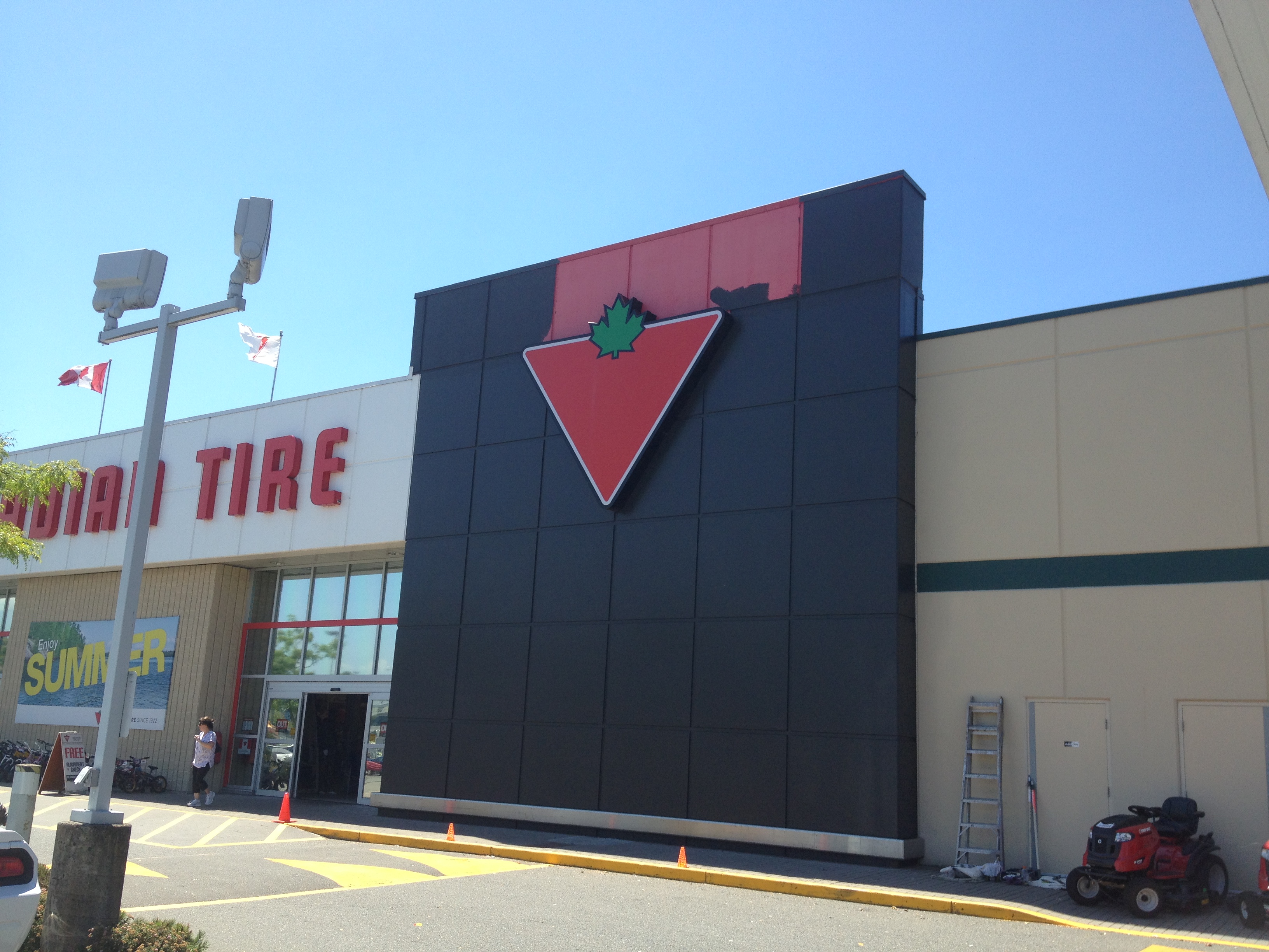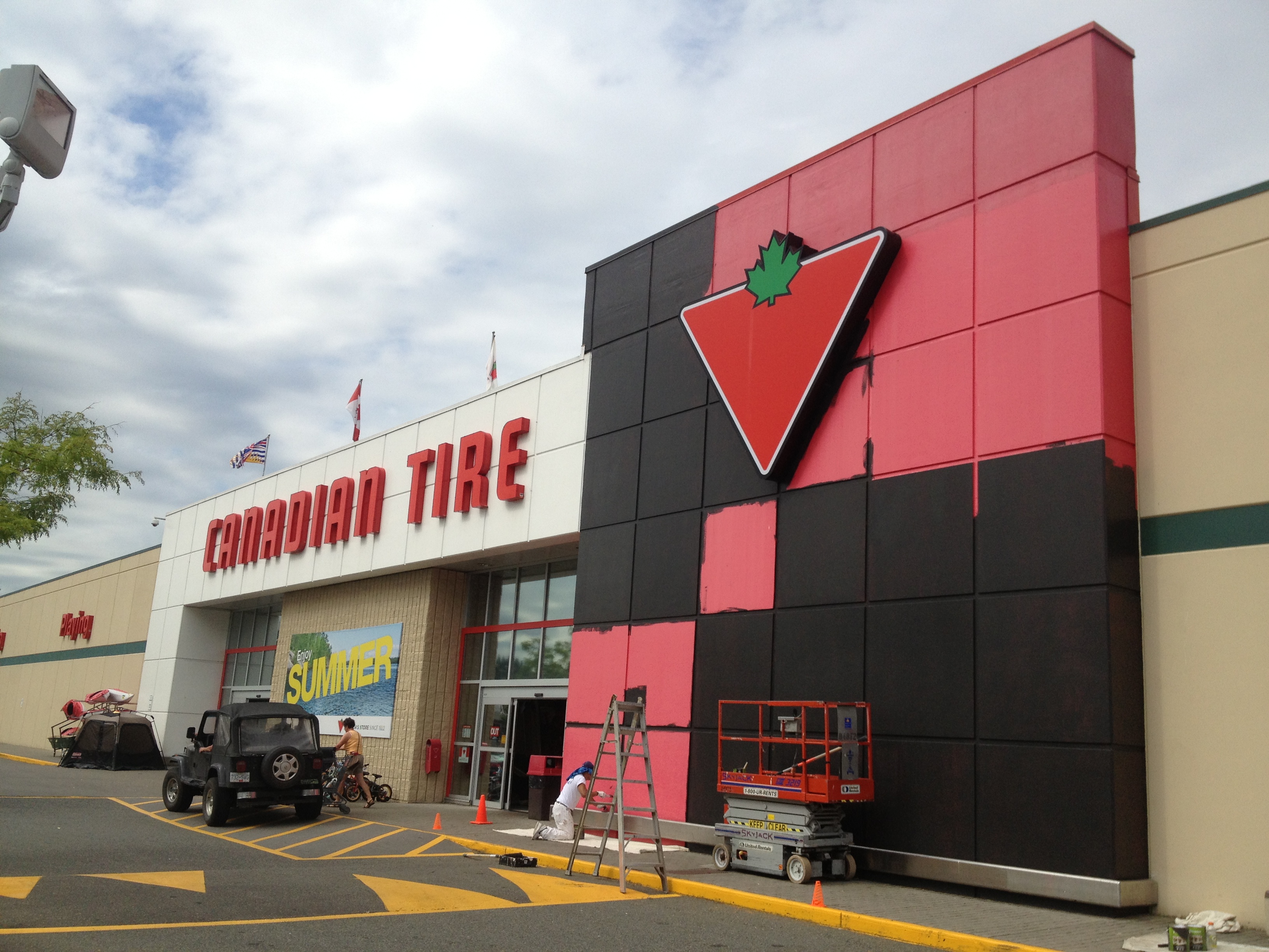 We saw a red wall and we wanted to paint it black! Working one square at a time. This is an exterior repaint project that completed for the Abbotsford Canadian Tire location.