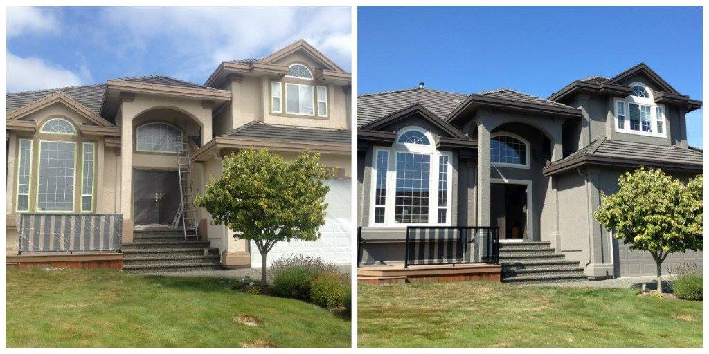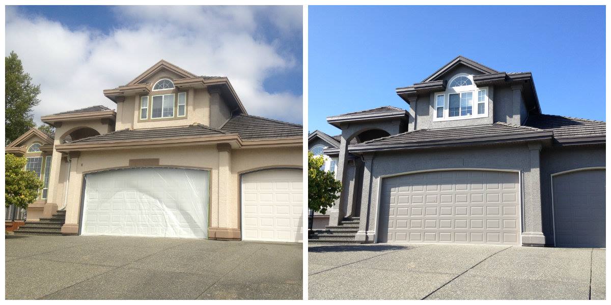 This is a before (left) and after (right) shot of a house repaint we did for a stucco home in South Surrey, BC. This well-planned change of colours helps to modernize the home and provide some excellent curb appeal.