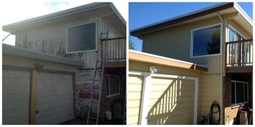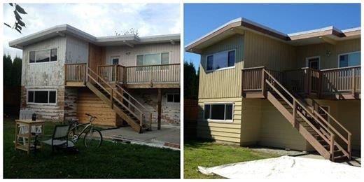 This is a before and after shot of a repaint we did for a home in Maple Ridge, BC. This exterior repaint was a huge project given the rough shape of the home prior to our work. We used Dulux Diamond Exterior Flat for the wood siding and FloodPro Solid for the fascia and trim.