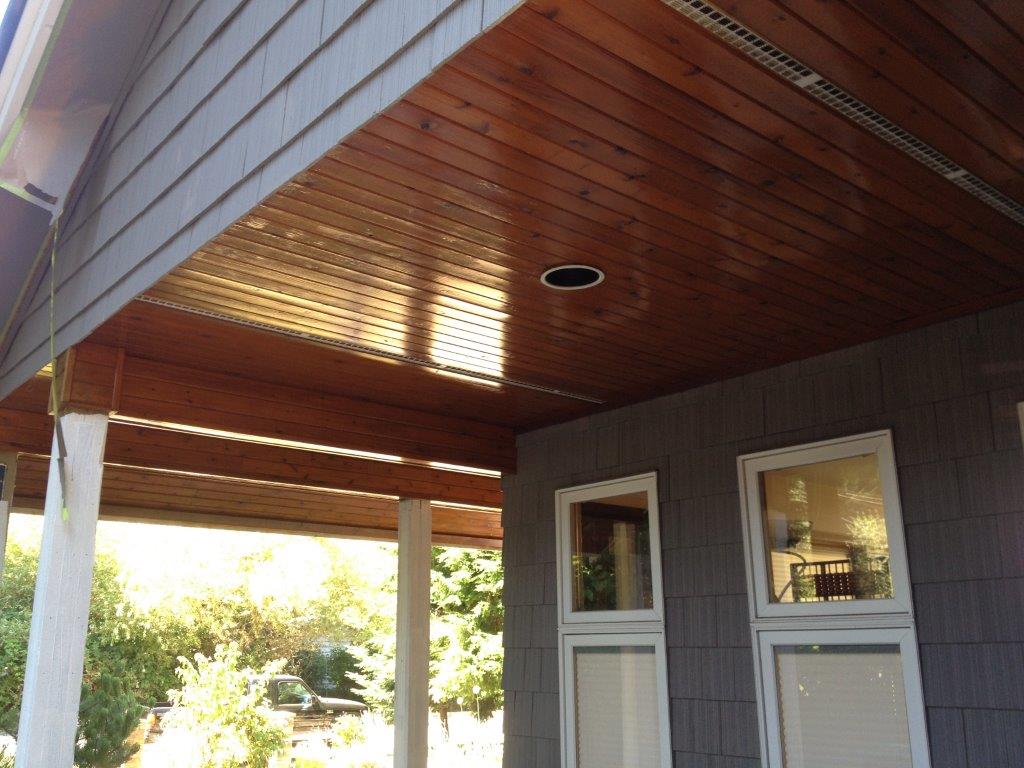 Sunfast exterior wood varnish from Cloverdale paint creates some spectacular looking soffits, as seen on this beautiful home located in White Rock, BC.